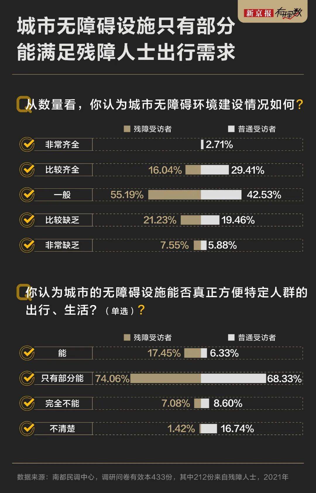 因为健全人士日常生活中较少使用无障碍设施,不容易察觉到这些设施可能存在的不合理之处,所以在调研中,普通市民觉得设施还不错的比例比残障人群高不少。这也说明,无障碍设施好不好用,不是修了就行,得让使用者说了算。