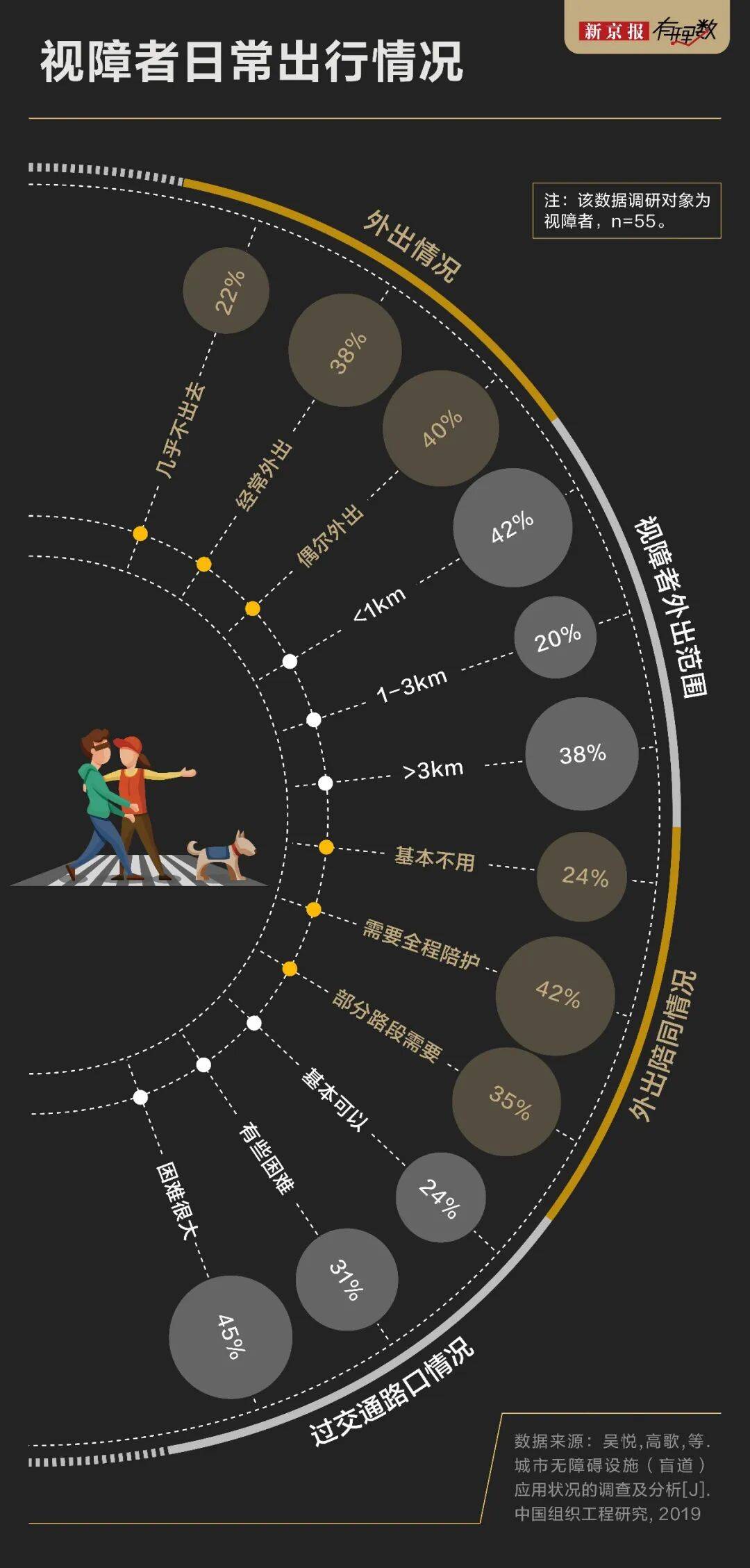 大部分视障朋友都有出门的想法,但真正能经常出去的没多少,还有不少人干脆几乎不出门。就算出门,活动范围也特别小,大多就在家附近一公里以内打转,能走出三公里以外的只是少数。不是他们不想走远,而是出门的“麻烦”实在太多了。