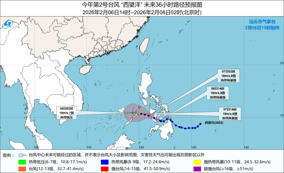 2月4日20时,今年第2号台风“西望洋”(热带风暴级,英文名:Penha,名字来源:中国澳门,意义:西望洋山,澳门新八景之一)生成,6日14时其中心位于菲律宾马尼拉南偏东方向约660公里的海面上,就是北纬9.4度、东经124.0度,中心附近最大风力有8级(18米/秒),中心最低气压为998百帕。