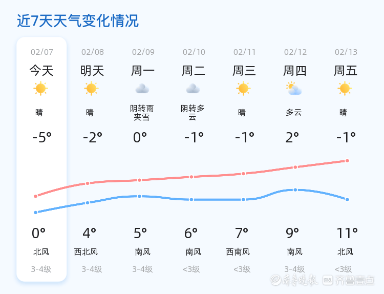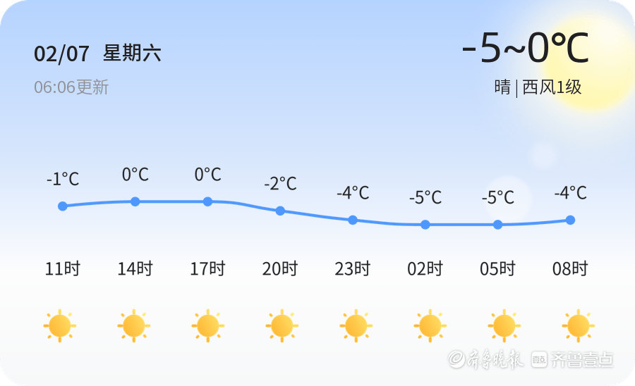 今天是2月7日,星期六,农历十二月二十。日照市迎来晴朗低温天气,全市各区气温普遍较低。今天白天最高气温0℃,最低气温-5℃,目前气温为-8.3℃,西风1级,空气湿度71%,空气质量良好(PM2.5指数27)。市民出行需注意防寒保暖,谨防感冒。