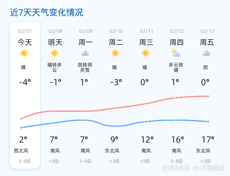 今日(2月7日,农历十二月二十)星期六,济宁市迎来晴朗天气。当前气温为-6.7℃,全天温度范围在-4℃至2℃之间,北风2级,空气湿度为82%,PM2.5指数为52,空气质量良好。各区县天气情况总体一致,均为晴朗天气,气温较低,市民出行请注意防寒保暖。