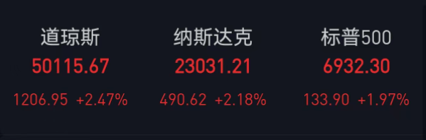 截至收盘,标普500指数涨1.97%,报6932.3点;纳斯达克综合指数涨2.18%,报23031.21点;道琼斯工业平均指数涨2.47%,狂飙1206.95点报50115.67点。