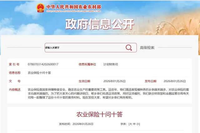 农业保险是国家保障粮食安全、稳定农业生产的重要政策工具。这些年,咱们搞适度规模种养的乡亲越来越多,对农业保险的需求也越来越强烈。为了把大家关心的问题讲明白,帮乡亲们吃透这项政策、用好这项福利,农业农村部计划财务司联合财政部和金融监管总局有关司局一起整理了这份十问十答的宣传材料。希望对乡亲们有所帮助。