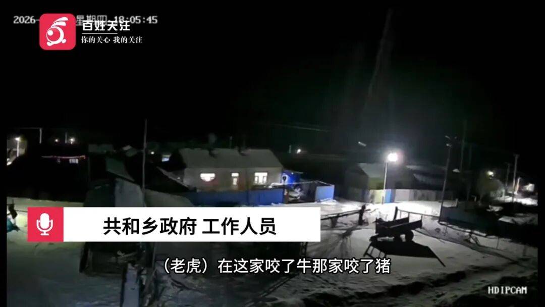 共和乡政府 工作人员:村里有两家,(老虎)在这家咬了牛、在那家咬了猪。猪吃了牛没吃,应该是大牛护小牛了。它头一天晚上咬死了那家的一头猪没吃完,应该是想来吃剩下的猪肉的,所以它对着那户人家看。屋子里有人,也亮了灯,它也不敢进院,就在那个门口徘徊。监控录到它之后,我们乡政府也去了很多人,带了很多鞭炮在那个村子放了两个小时,它应该也就走了。