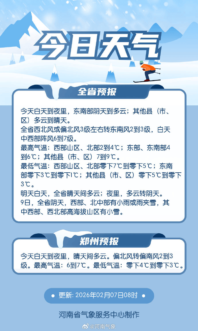 今天(2月7日)是这轮冷空气影响的最低温时段。尤其在早晨,大家出门一定要“捂”装到位。西部山区和北部的最低气温会降到零下7℃到零下5℃。南部地区在零下2℃到0℃之间。省内其他地区,最低气温也普遍在零下4℃到零下2℃。