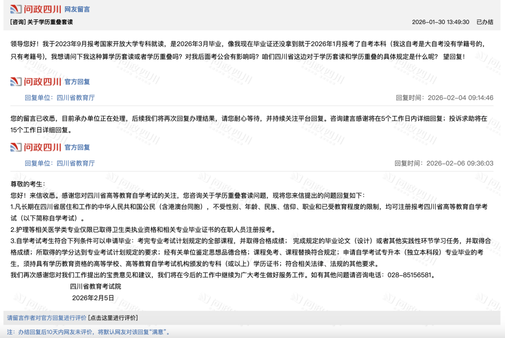同样在1月29日晚,另一名网友也通过“问政四川”平台,向四川省教育厅咨询“学历重叠”问题。