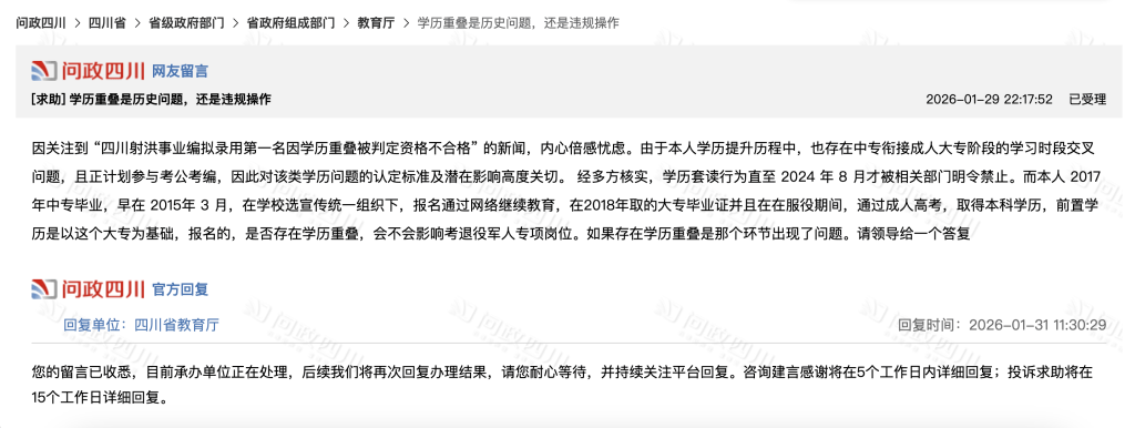 1月29日22时许,一名网友在“问政四川”平台,以《学历重叠是历史问题,还是违规操作》为标题,向四川省教育厅求助称:“因关注到‘四川射洪事业编拟录用第一名因学历重叠被判定资格不合格’的新闻,内心倍感忧虑。由于本人学历提升历程中,也存在中专衔接成人大专阶段的学习时段交叉问题,且正计划参与考公考编,因此对该类学历问题的认定标准及潜在影响高度关切。”