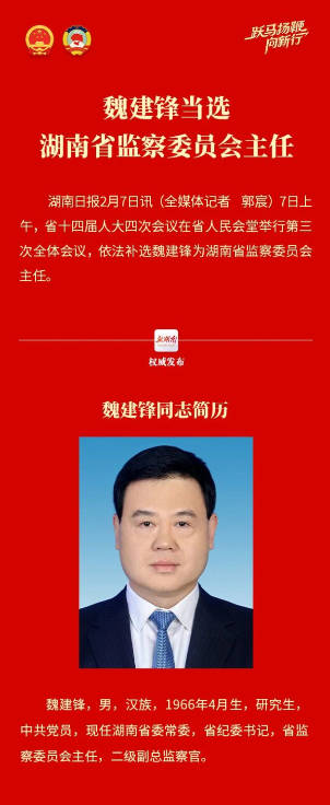 据湖南日报,2月7日,湖南省十四届人大四次会议在省人民会堂举行第三次全体会议,依法补选魏建锋为湖南省监察委员会主任。