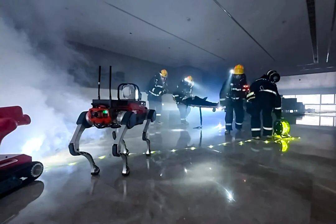 在河南省超高层建筑灭火应急救援综合实战演练中,消防人员与机器狗协同作战。