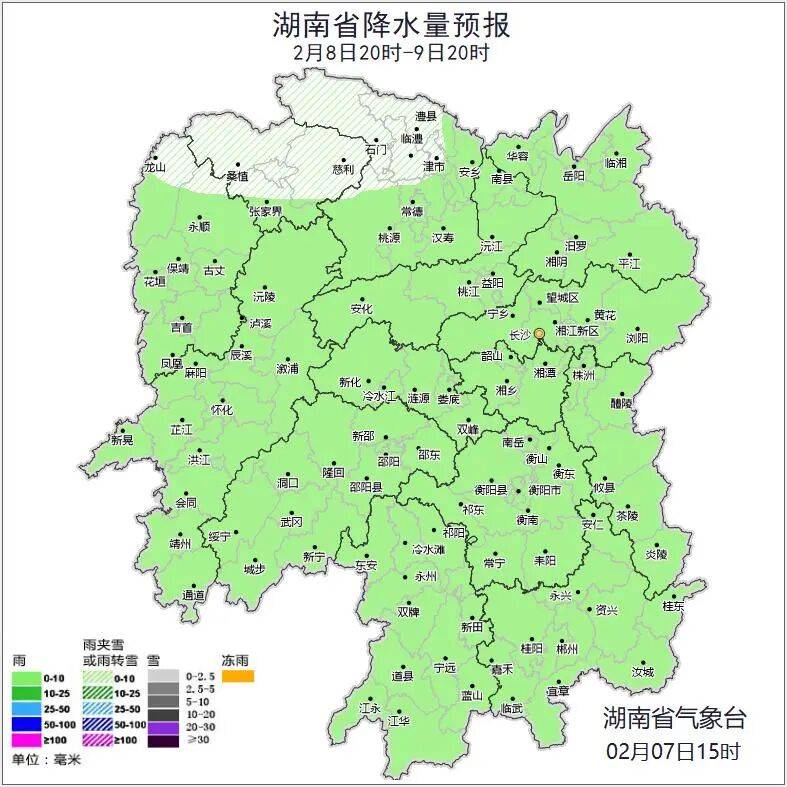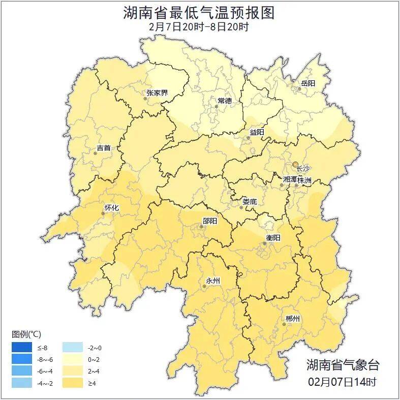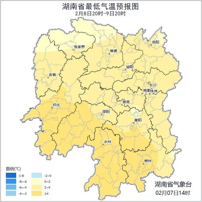 2月8日白天,湘中以南大部分地区阴天有小雨,其中,湘西南高海拔地区有雨夹雪,其他地区多云;北风3级;最低气温湘北0~3℃,其他地区3~6℃;最高气温10~13℃。