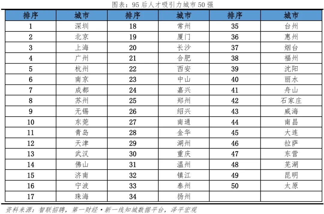先看深圳,深圳房地产保值率为什么能拿第一?核心优势是“创新红利+年轻人口流入”,深圳是粤港澳大湾区的龙头,是全国创新最活跃的城市,诞生了像华为、腾讯、比亚迪、大疆这样的世界级高科技企业,贡献了万亿级的产值,提供了百万级的高薪就业岗位。而且,深圳人口质量在全国首屈一指,在泽平宏观和智联招聘联合发布的《中国城市95后人才吸引力排名》中,深圳连续两年位居全国榜首,深圳14-35岁青年人口超800万,占全市人口46%,年轻、高学历、高收入的人口结构,带来了源源不断的购房需求。所以,过去十年深圳房地产保值率在全国排第一,就问你服不服?