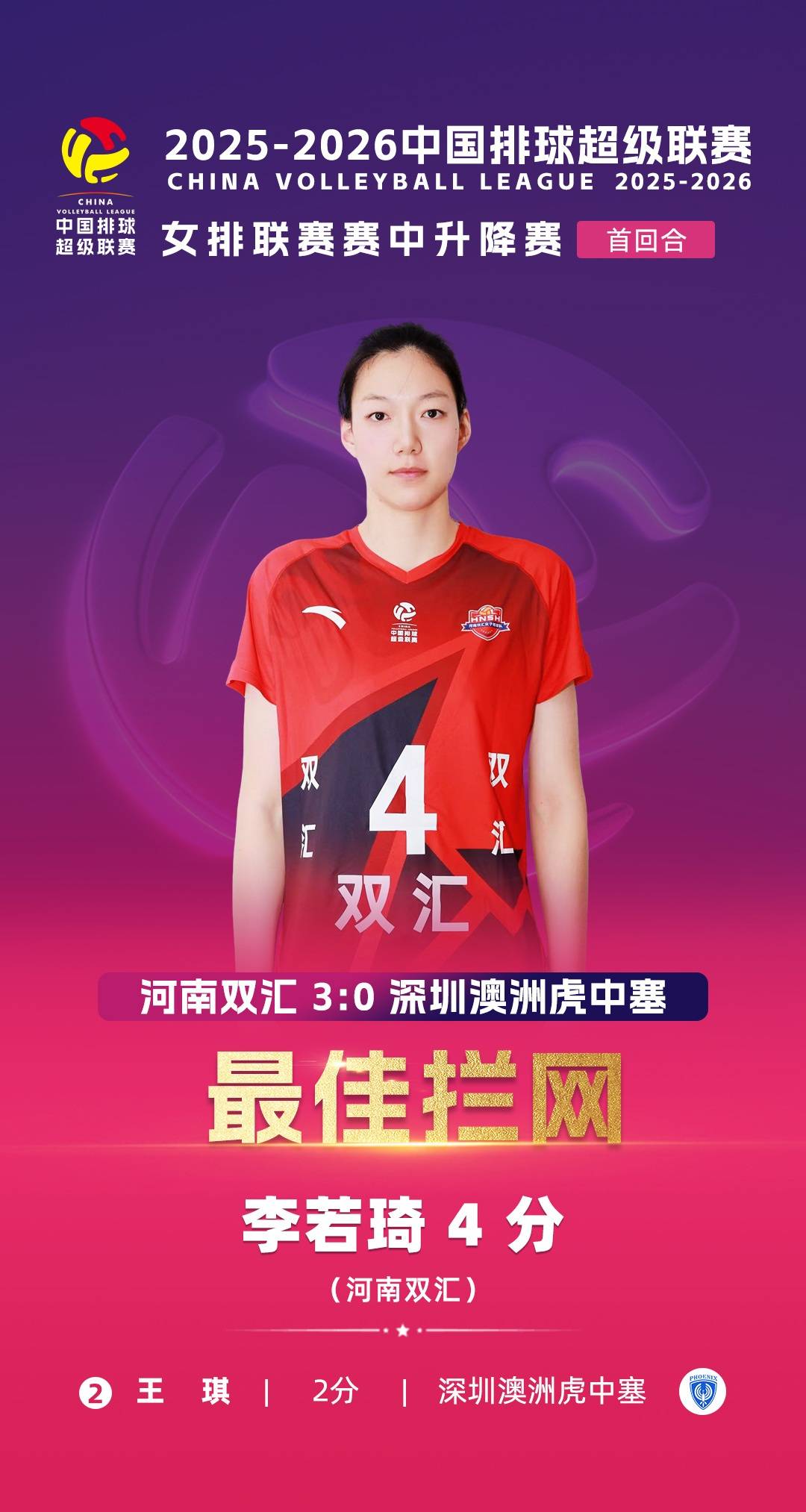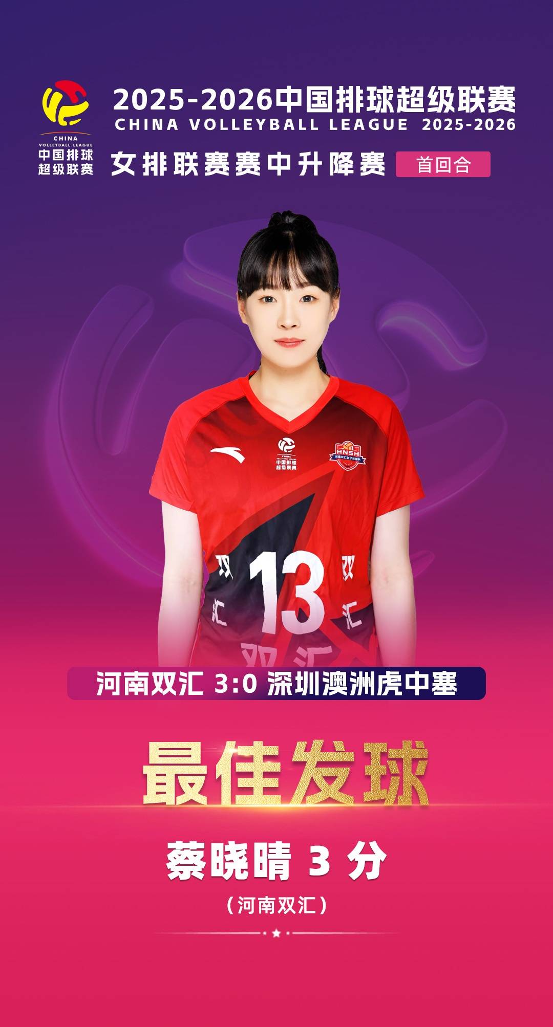 In the first leg of the promotion/relegation match, Henan defeated Shenzhen 3-0 at home. The scores of the three sets were: 25-23, 25-18, 28-26. Duan Mengke scored 20 points, earning the MVP award for both points and spike. Cai Xiaoqing also scored 20 points, but her success rate was lower than Duan's.
