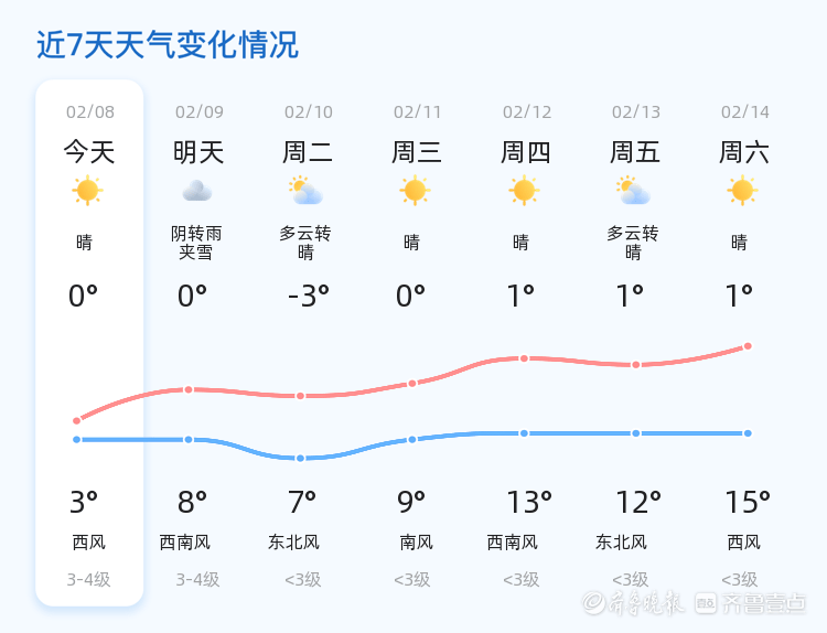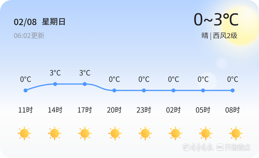 2月8日(农历十二月廿一),东营市迎来晴朗天气。今日气温较低,最高气温3℃,最低气温0℃,西风2级,空气湿度40%,PM2.5指数53,空气质量良好。全市各区天气情况一致,均为晴朗,适合市民户外活动。