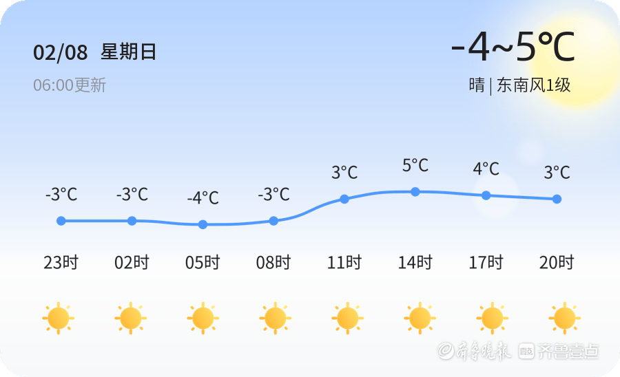 今天是2026年2月8日,农历十二月廿一,济南迎来晴朗天气。今日气温较低,早晨最低气温为-4℃,白天最高气温为5℃,温差较大。风向以东南风为主,风力1级,空气湿度为42%,空气质量指数(AQI)为48,属于良好水平。今日天气适宜出行,但早晚温差较大,市民出行时请注意保暖,建议佩戴口罩以防风沙。