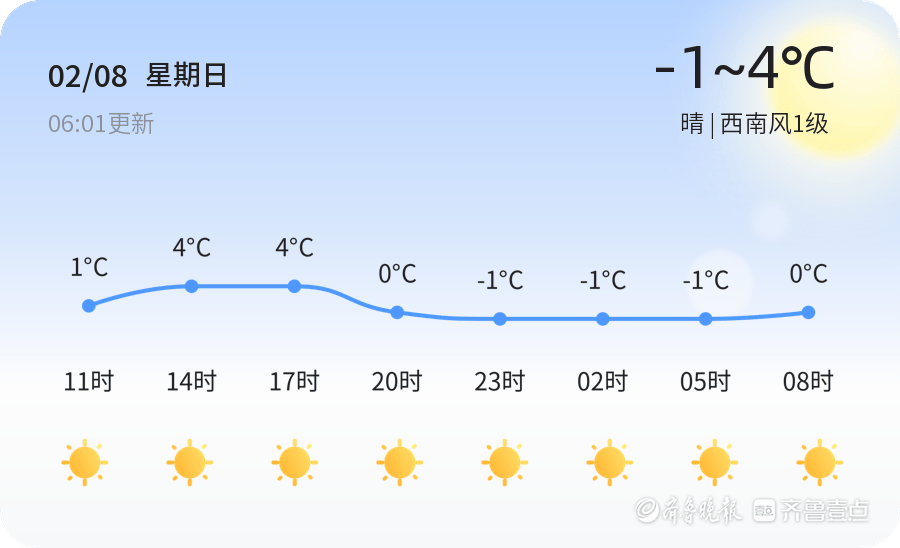 今日是2月8日,星期日,农历十二月廿一。淄博市天气晴朗,气温较低,当前温度为-11.7℃,预计今日最高气温为4℃,最低气温为-1℃。西南风1级,空气湿度为78%,空气质量良好(PM2.5为60)。市民出行时建议穿着厚实的防寒衣物,谨防感冒。