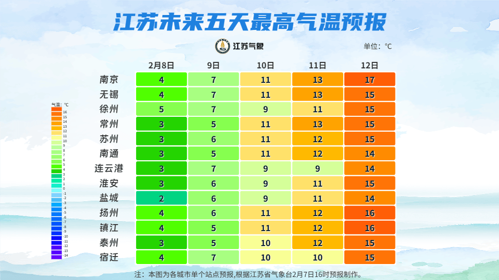 2月8日20时至2月9日20时:全省多云转阴。最高温度:全省6℃左右;最低温度:全省-4℃左右,全省大部分地区有冰冻。全省偏南风4级左右。