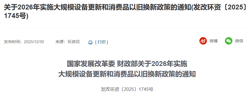 顶端新闻记者查询国家发展改革委网站后了解到,《关于2026年实施大规模设备更新和消费品以旧换新政策的通知(发改环资〔2025〕1745号)》文件中指出,支持智能家居产品(含适老化家居产品)购新补贴,具体补贴品类、补贴标准由地方结合实际自主合理制定。