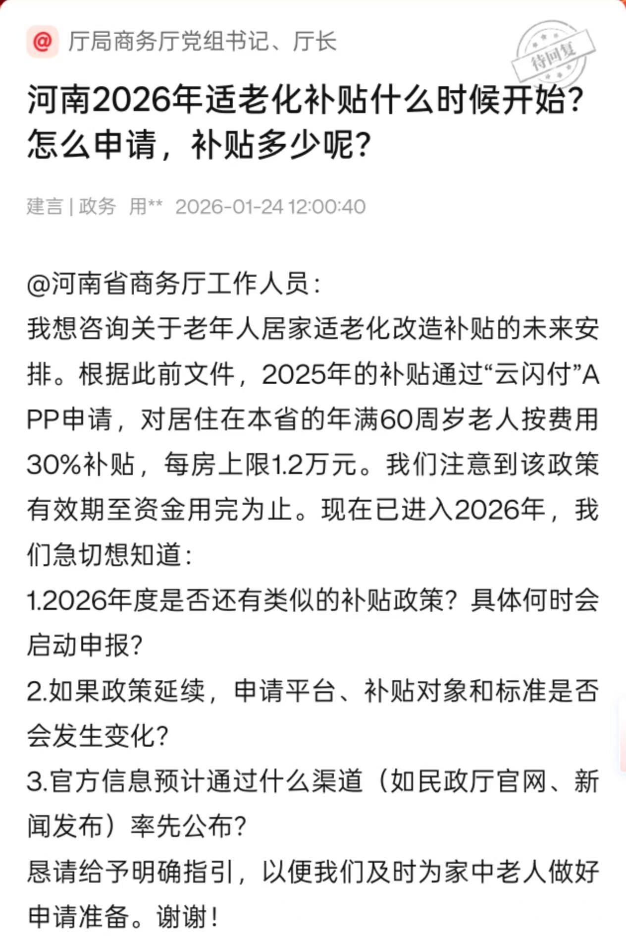 近日,顶端新闻“我想@领导”问政平台接连收到多名网民咨询,关注今年河南是否继续实施适老化家居改造补贴政策,以及具体执行细则。