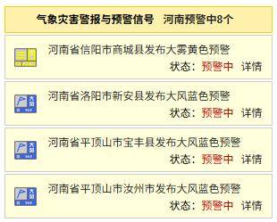 据预报显示,信阳、洛阳、平顶山等地发布大雾、大风等预警信号。截至2月8日8:40,河南省共有8条预警信号生效中。