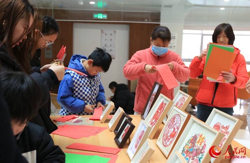 义写春联活动现场群众参与剪纸。人民网记者 宋芳鑫摄