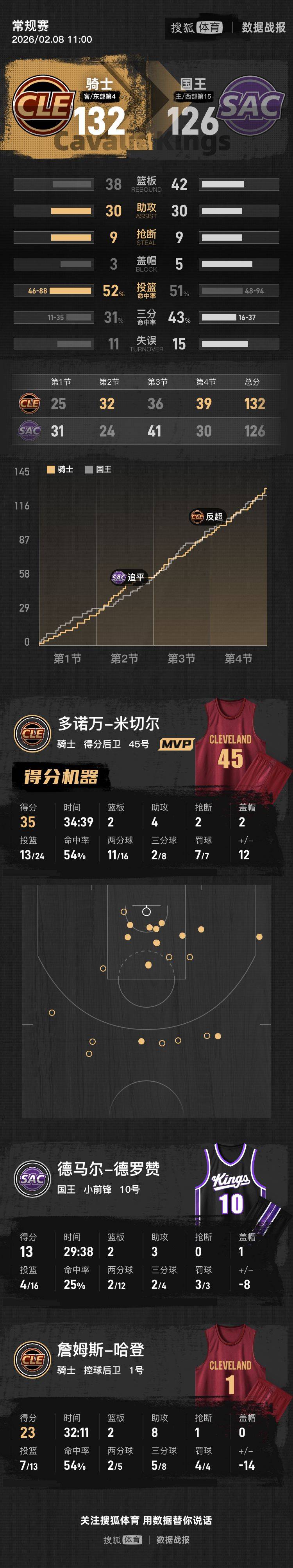 最后一节,国王开局表现出色,打出一波攻击高潮,将领先优势扩大到了121-114。然而,骑士随后开始反击,不仅抹平比分,甚至一度领先国王6分。随着比赛的深入,国王努力追赶,但未能实现逆转。本节比赛中,骑士的米切尔表现突出,单节斩获17分。最终,骑士以132-126赢得比赛。