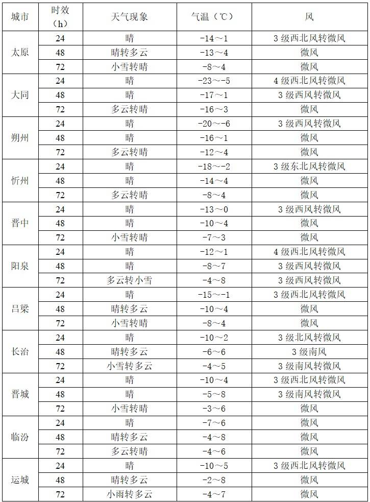 气温(全省平稳):最高温:全省统一 0℃~9℃;最低温:高寒地带约 -17℃,北中部+南部山区 -13℃~-6℃,南部其他地区 -6℃~-1℃。