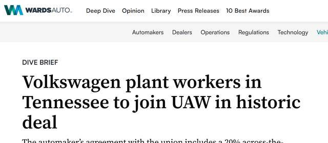 【环球网科技综合报道】2月8日消息,据WardsAuto报道,当地时间周三晚间,大众汽车集团与美国汽车工人联合会(UAW)共同宣布,双方就位于美国田纳西州查塔努加工厂的约3000名员工薪资待遇、权益保障等事宜达成临时劳动合同。这是该工厂历史上首次与工会达成此类协议,成为当地劳资协商的里程碑事件,目前协议仍待工会成员投票批准。