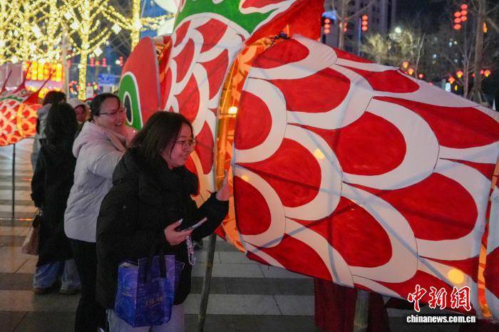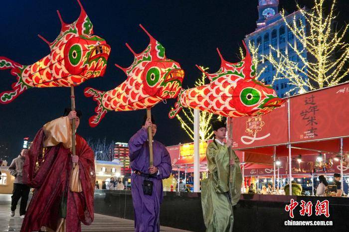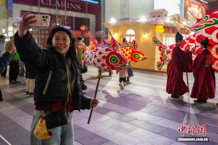 2月8日晚,河南郑州金水区花园路商圈一商场外举行鱼灯巡游表演,吸引众多市民和游客驻足观看、拍照打卡,巡游活动“解锁”商圈年味。图为鱼灯巡游现场。中新社记者 范晓恒 摄