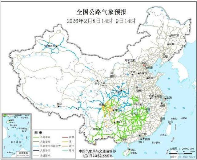 图3 全国公路气象预报图(2月8日14时至9日14时)