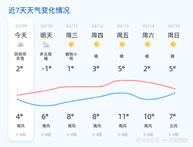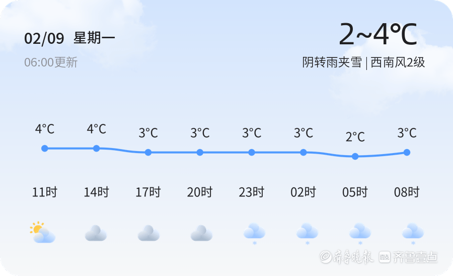 今天是2月9日,农历十二月廿二,星期一。青岛市今日天气阴转雨夹雪,气温在2℃至4℃之间,西南风2级,空气湿度为42%,PM2.5指数为60,空气质量良好。各区县天气情况基本一致,市民出行请注意防寒保暖,雨具随身携带。nn明天青岛市天气将转为多云到晴,气温稍有回升,最低气温-1℃,最高气温6℃,南风3-4级。与今天相比,天气状况有所改善,但仍有小幅降温,市民仍需注意保暖。nn未来三天,青岛市天气趋势为晴转小雨,气温在1℃至8℃之间波动。预计11日有小雨天气,出行请注意携带雨具,防范道路湿滑。12日和13日天气晴朗,气温逐渐回升,但早晚温差较大,市民需及时增减衣物。nn温馨提示