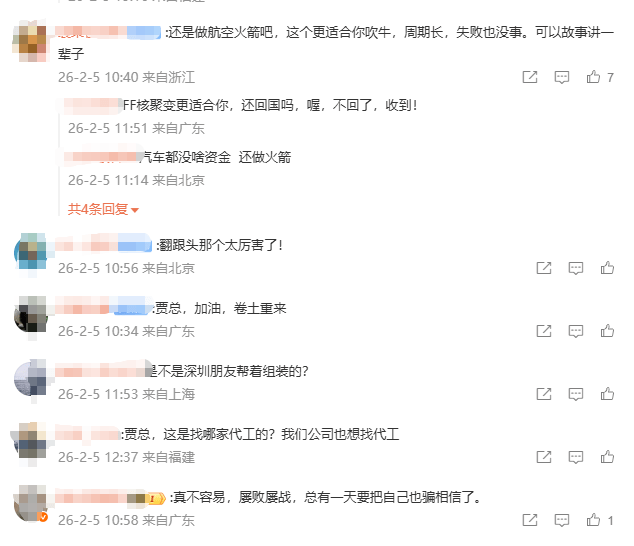 有网友讽刺道:“还是做商业航天火箭吧,这个更适合你吹牛,周期长,失败也没事。”;也有网友复刻其当年乐视经典名言,调侃道:“为梦想再次窒息!”同样也有网友感慨:“真不容易,屡败屡战,总有一天要把自己也骗相信了。”