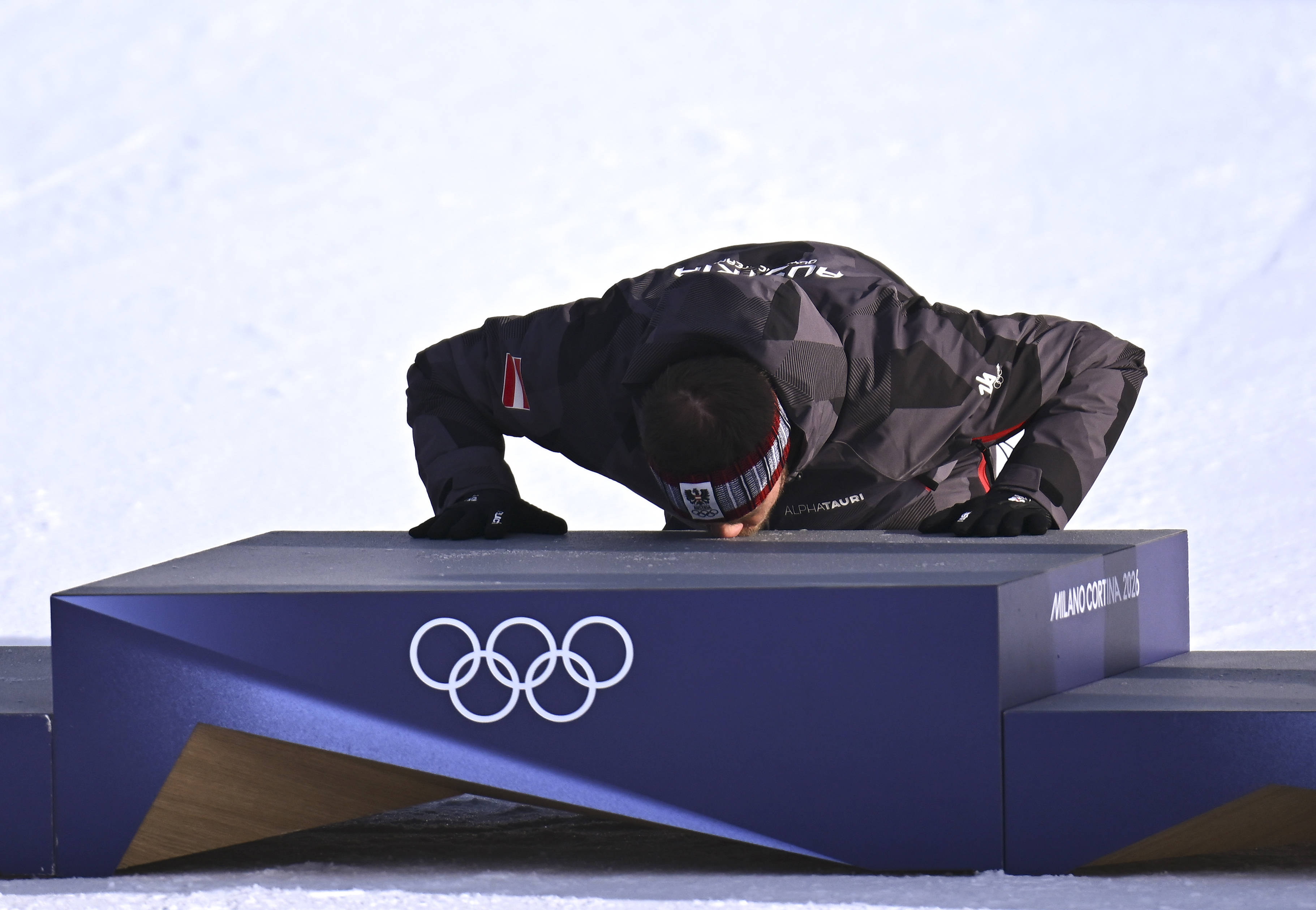 搜狐体育消息,北京时间2月9日,冬奥会单板滑雪项目男子平行大回转比赛,40岁的奥地利选手本亚明-卡尔获得冠军,在颁奖仪式中,本亚明-卡尔疯狂庆祝。