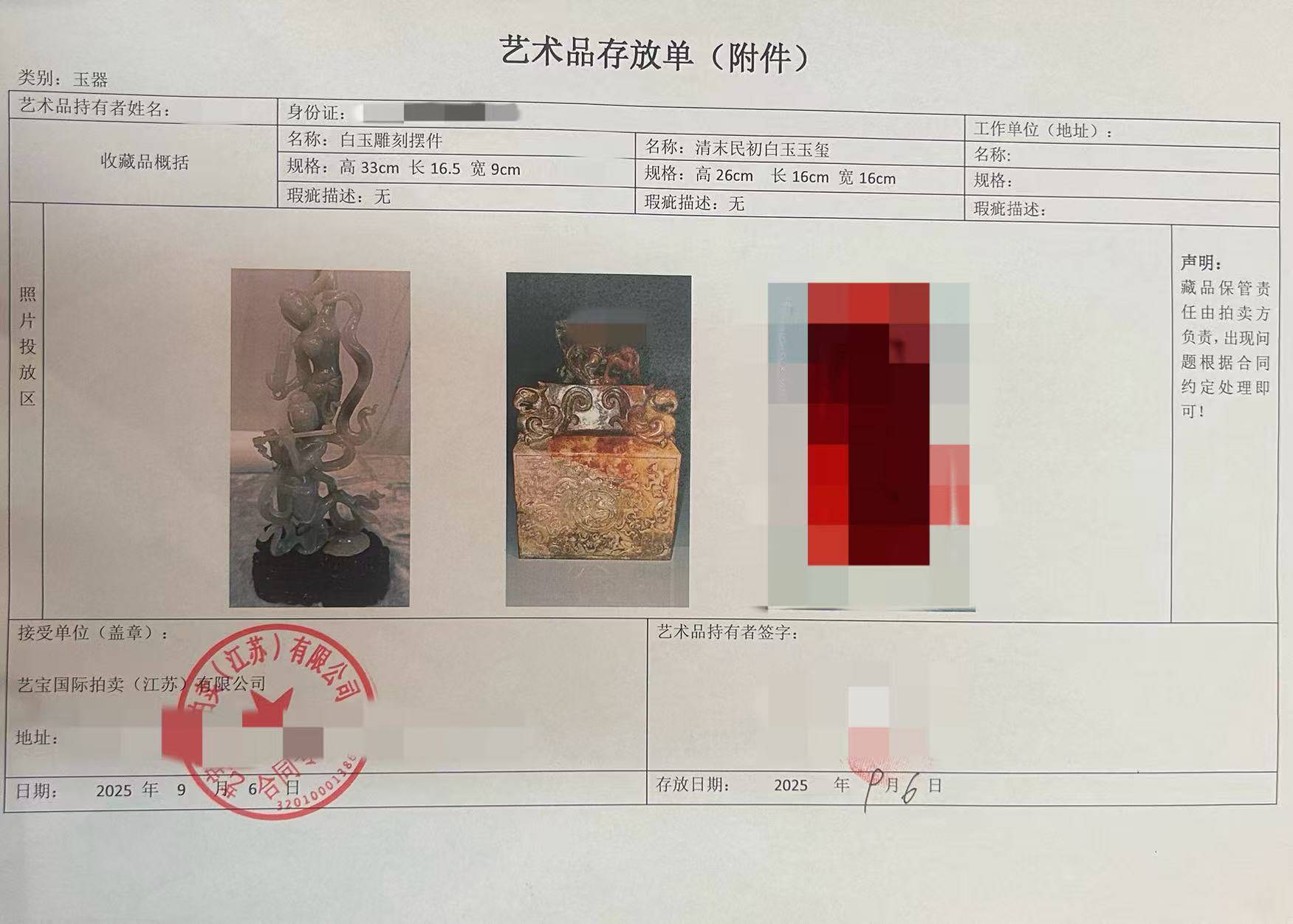 拍卖公司为林宛出具的“艺术品存放单”。 图/受访者提供