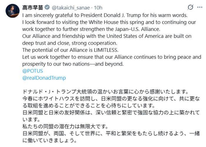 高市早苗写道,“我衷心感谢总统特朗普的亲切致辞,并期待着今年春天访问白宫。我将继续与特朗普总统共同努力,进一步巩固日美同盟。”高市早苗认为,“日美的同盟关系与友谊是建立在深厚信任及紧密牢固合作基础之上的”。她最后写道:“让我们携手合作,确保同盟继续为两国乃至更广泛地区带来和平与繁荣。”