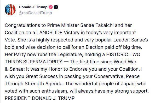 据报道,特朗普在社交媒体“真实社交”上发文称,“很荣幸”支持高市早苗及其执政联盟,“热情投票的日本人民将永远得到我的坚定支持”。