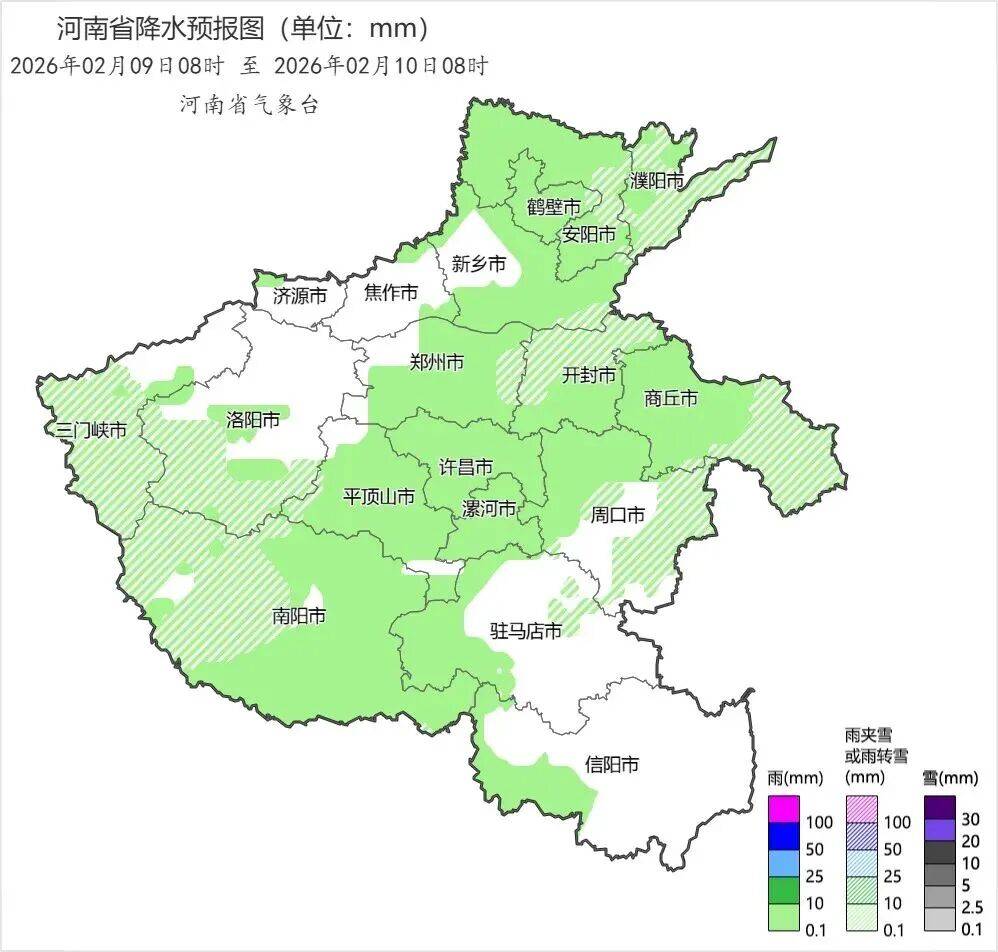 今天(9日),全省将从晴冷模式切换为阴天模式。大家最关心的雨雪分布已经明确:三门峡南部、洛阳南部、南阳、平顶山西部、开封东部和商丘这几个区域,将出现雨夹雪或小雪;省内其他大部分地区则以零星小雨或小雨为主。