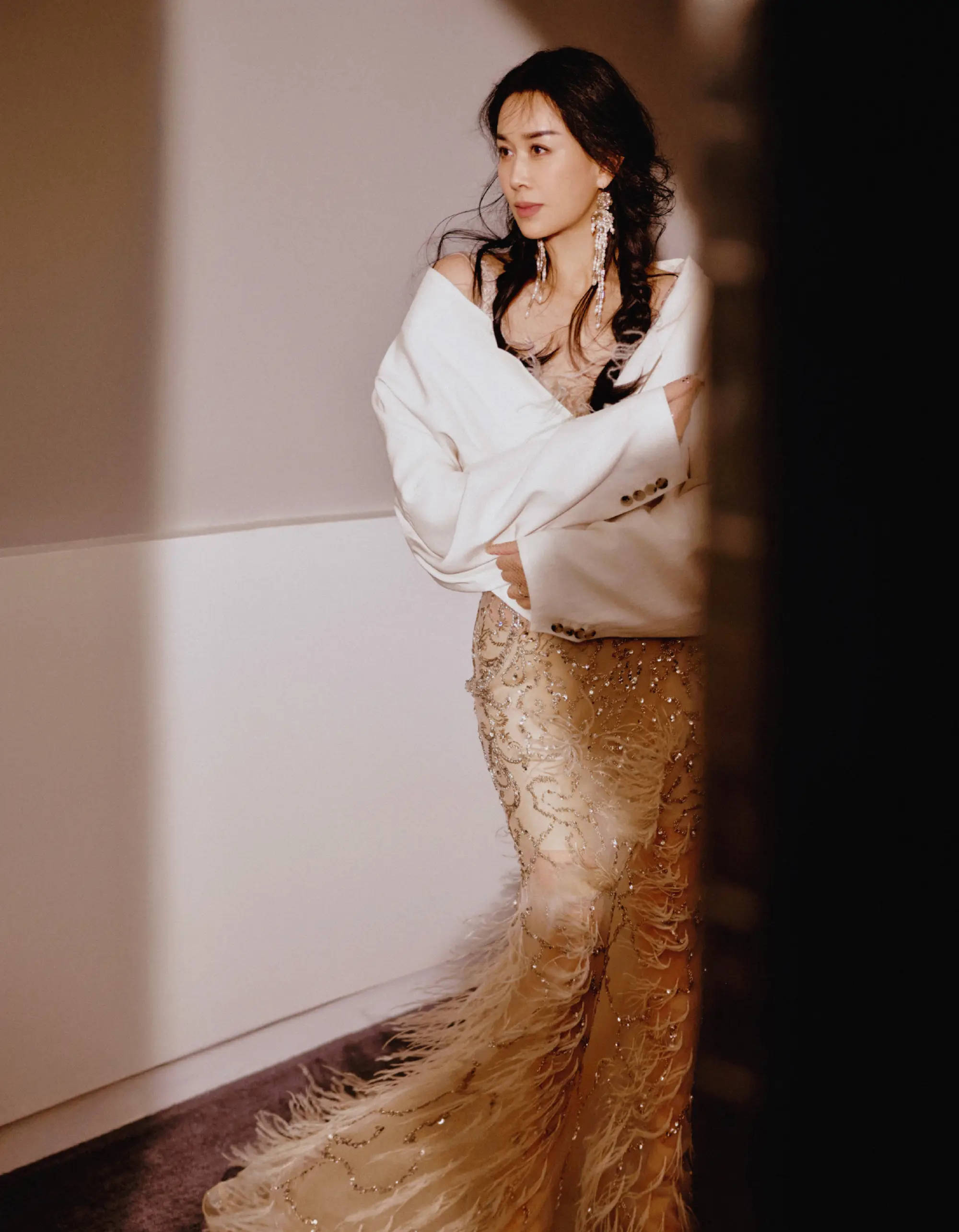那英穿羽毛裙勾勒好身材。