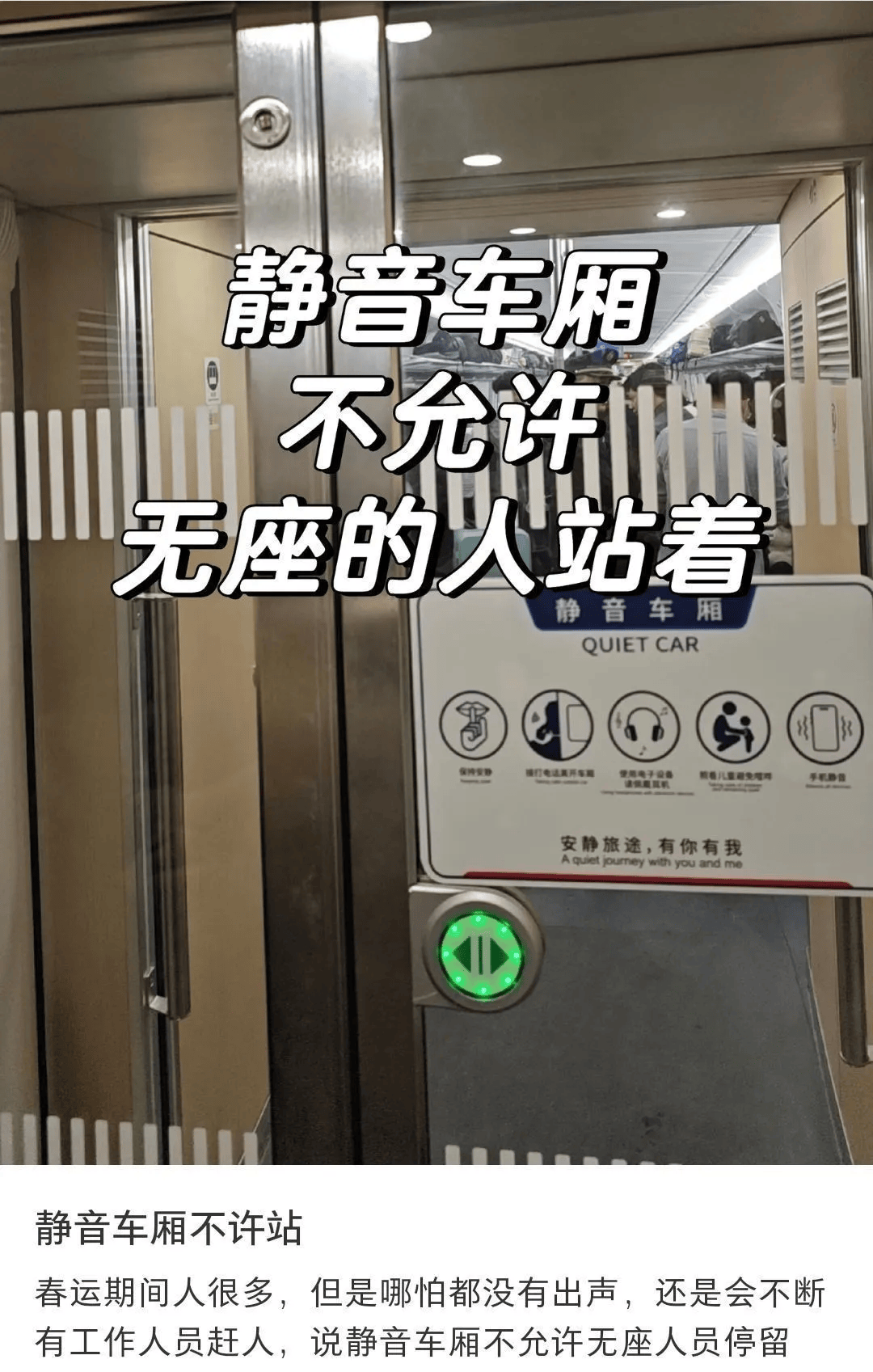 可能有人会说,平时不让人站到静音车厢可以理解,但春运等节假日高峰期间,客流量大,站票卖得多,普通车厢太拥挤的话,是否应当允许部分人站到静音车厢里?