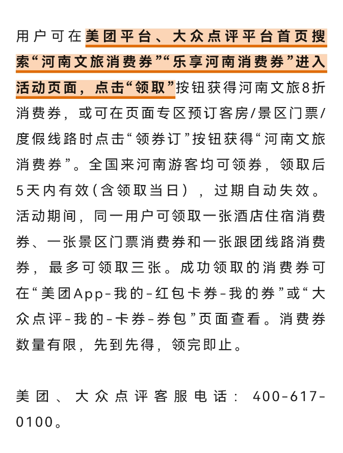 为抢抓消费旺季,惠民利企,释放消费潜力,为全国游客营造良好的节日文旅消费环境,河南省将于2026年2月10日—3月8日面向全国游客发放2026年“乐享河南”新春文旅、住宿类消费券。