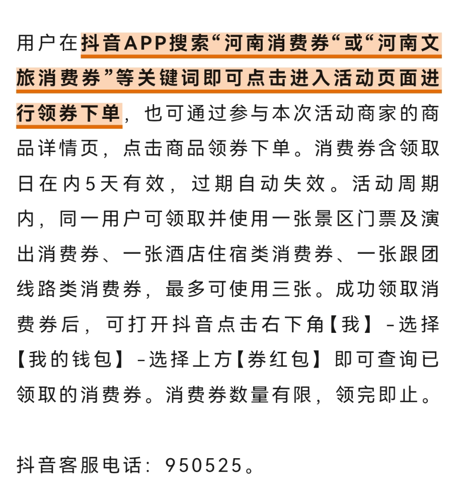 发放期间,在发放平台设置专属线上“河南文旅消费券”活动页面,用户在平台搜索“河南文旅消费券”,进入活动页面点击“领取”按钮即可获得酒店住宿、景区门票及演出、跟团线路的河南文旅消费券。消费券自动放入用户账户,消费者支付订单时按折扣补贴对应的金额进行自动扣减。用户在平台内挑选指定产品并下单,立即享受折扣补贴,每笔消费限用一张消费券。