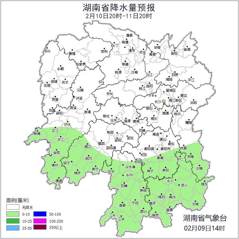 2月10日白天,湘北阴天到多云,湘南阴天有小雨,其他地区小雨转多云,10日清晨湘北局地有雾;北风2~3级;最低气温湘中以北1~4℃,其他地区5~9℃;最高气温湘西北、湘东南12~16℃,其他地区7~10℃。