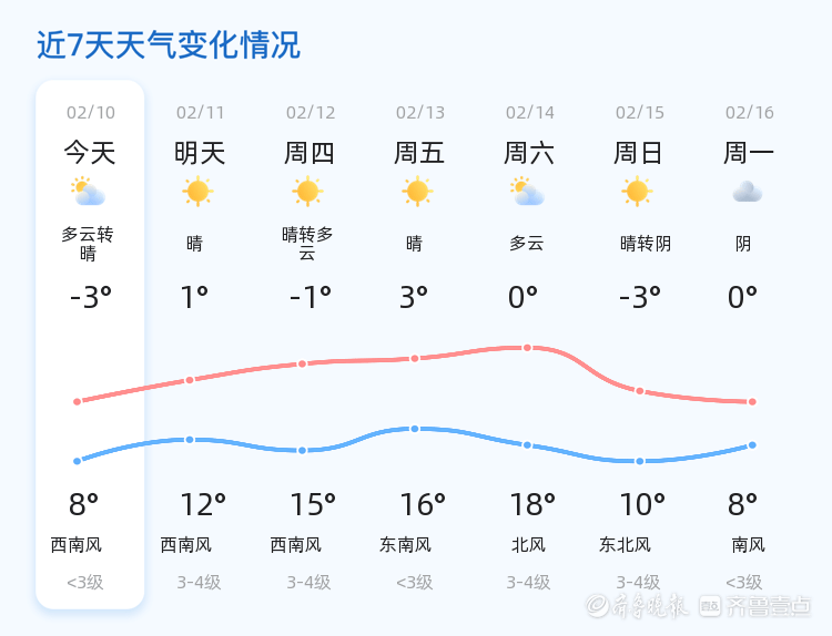 今天是2月10日,农历十二月廿三,星期二。德州市今日天气多云转晴,气温介于-3℃至8℃之间,南风2级,空气湿度为88%。全市各区天气情况基本一致,均为多云转晴,风力较小,适宜外出活动。明日天气将以晴朗为主,气温较今日有所回升,最低气温1℃,最高气温12℃,西南风3-4级。相较于今日,明日天气更加晴朗,温度更为适宜,市民可适当增加户外活动时间。未来三天,德州市天气趋势呈现升温趋势,最高气温可达15℃,最低气温-3℃。其中,周四晴转多云,风力3-4级;周五晴,东南风风力较小;周六多云,北风3-4级。市民需注意及时增减衣物,尤其是周四和周六的风力较大,出行时应做好防风准备。温馨提示