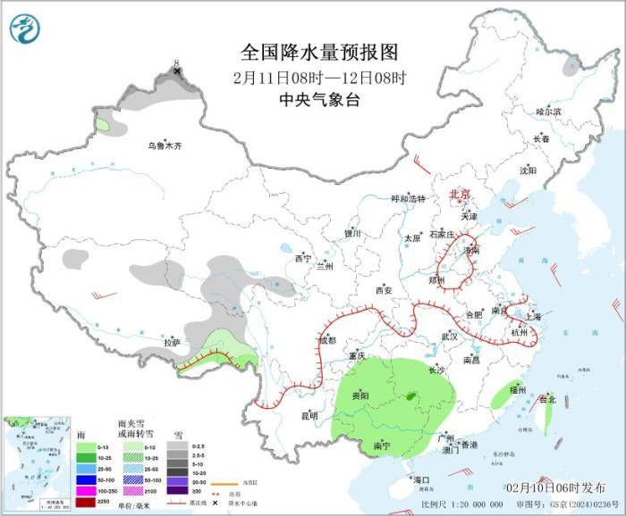 图1 全国降水量预报图(2月10日08时-11日08时) 图片来源:中央气象台网站