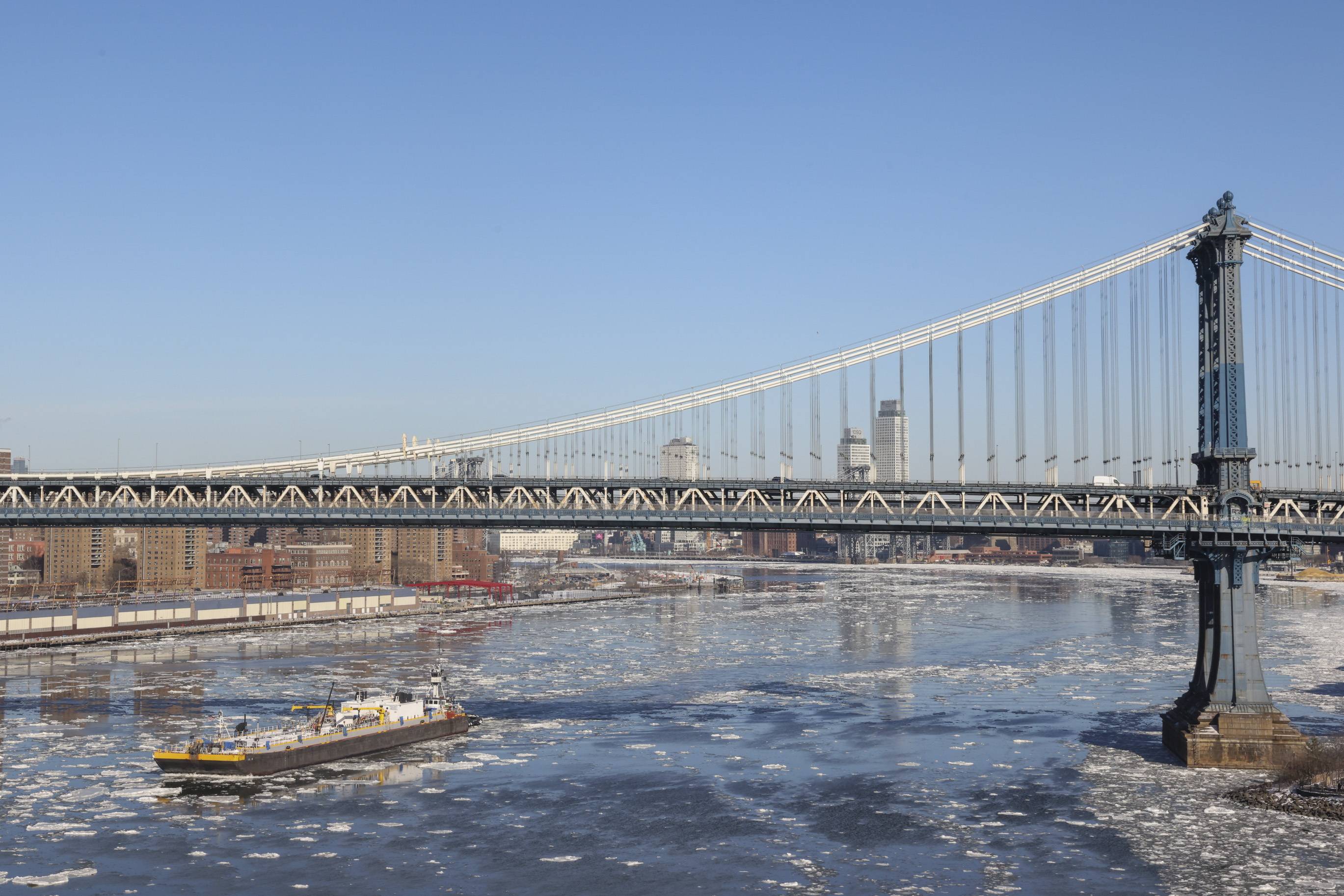 这是2月9日在美国纽约布鲁克林大桥上拍摄的严寒天气中的纽约港。 新华社/欧新