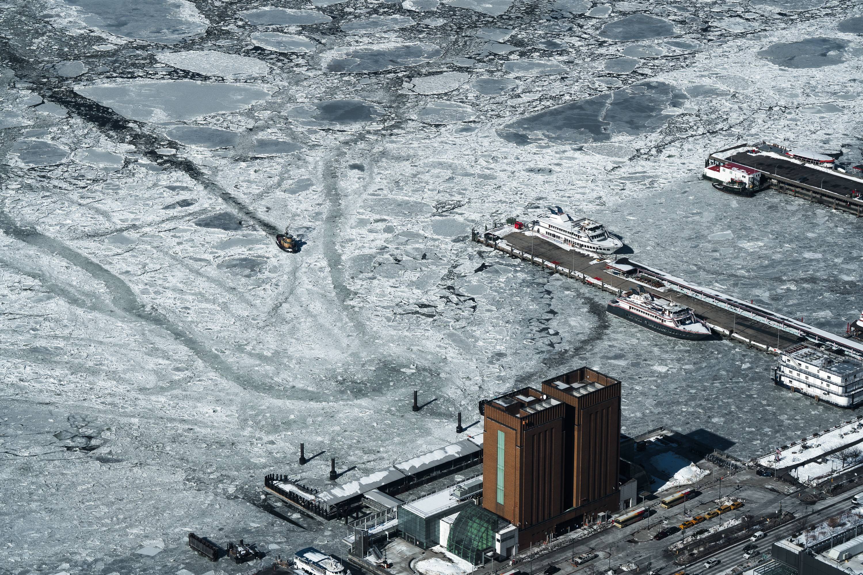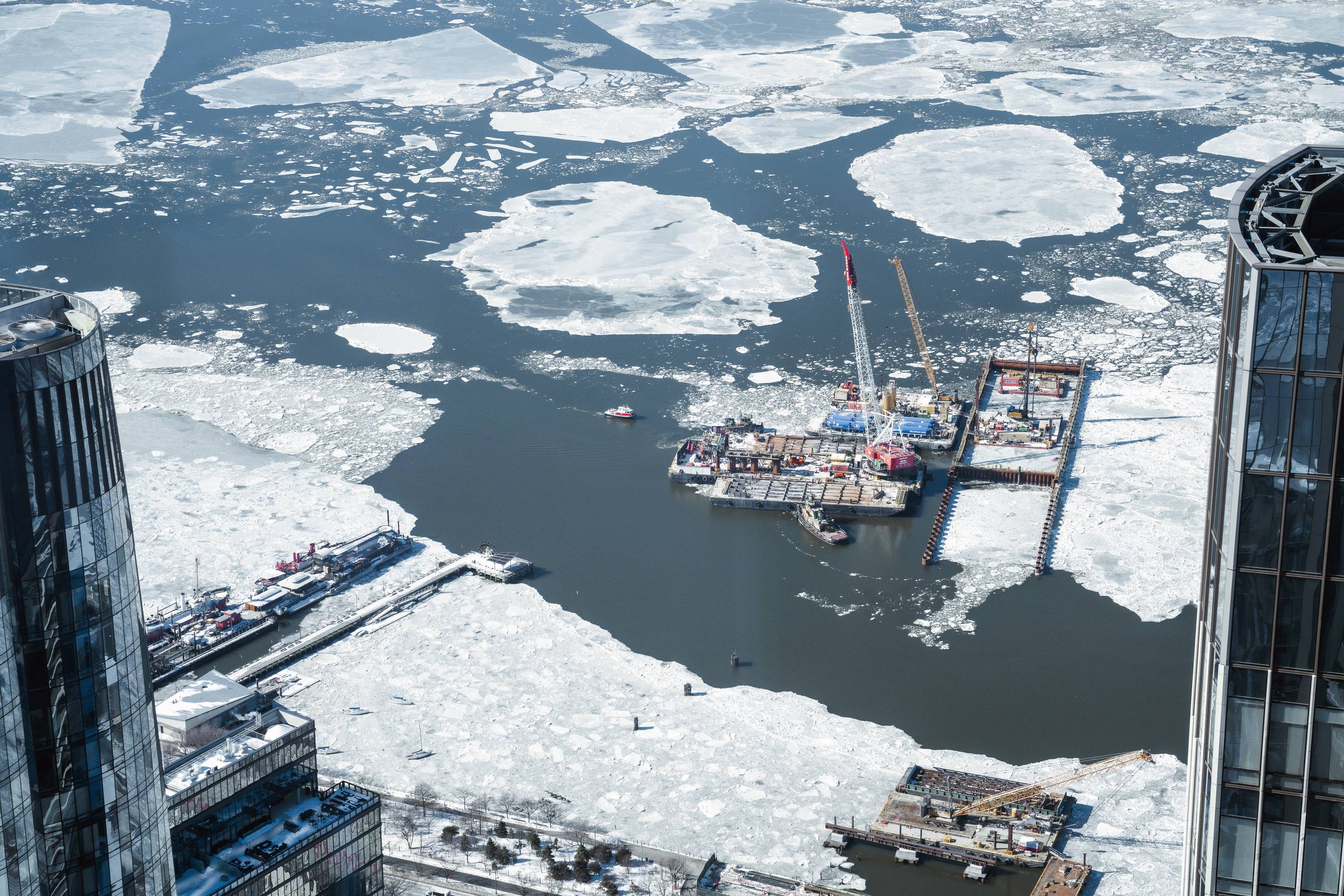 这是2月9日在美国纽约拍摄的漂着浮冰的纽约港和哈得孙河。 新华社/欧新