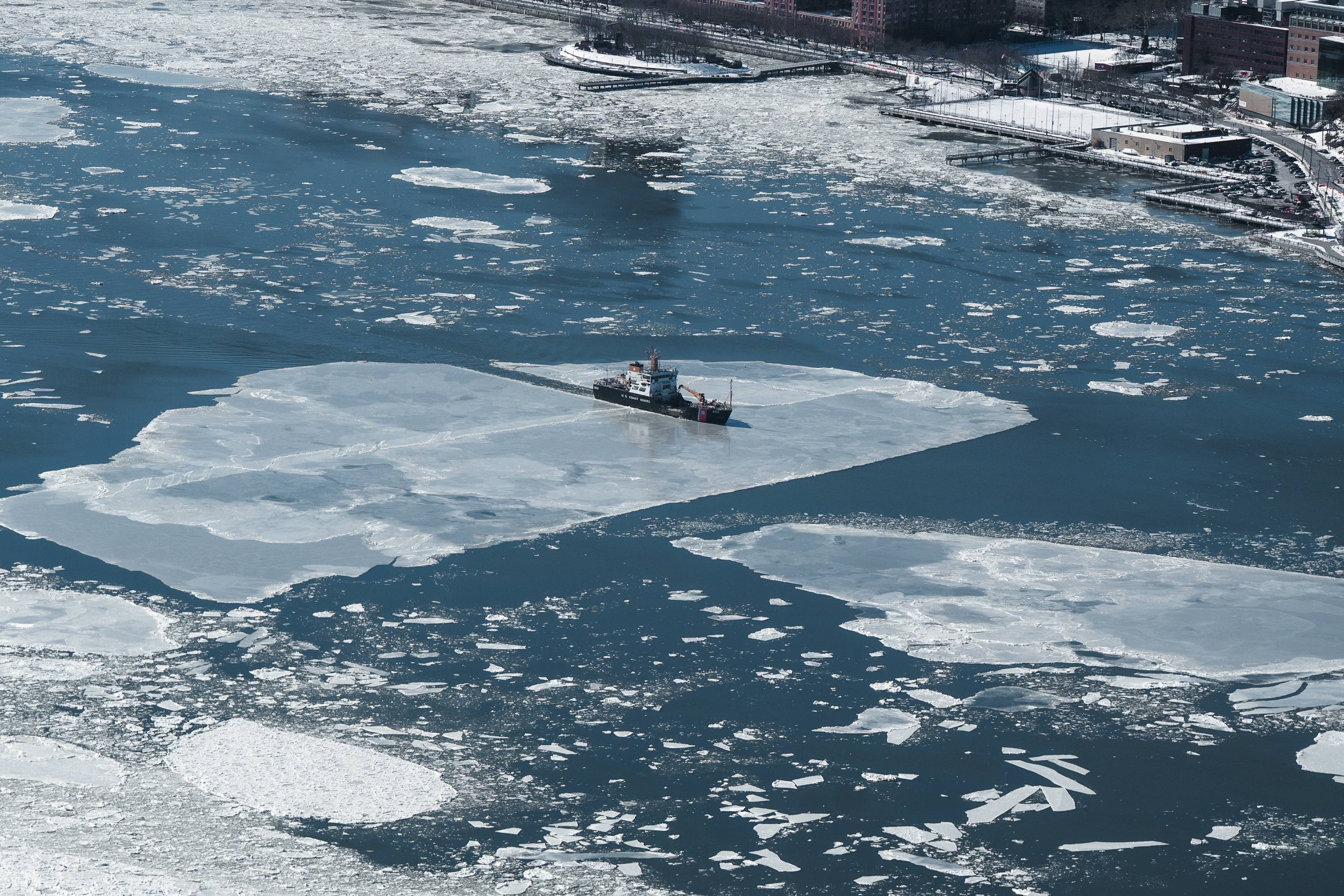 2月9日,一艘工程驳船停泊在美国纽约河面结冰的哈得孙河中。 新华社/欧新