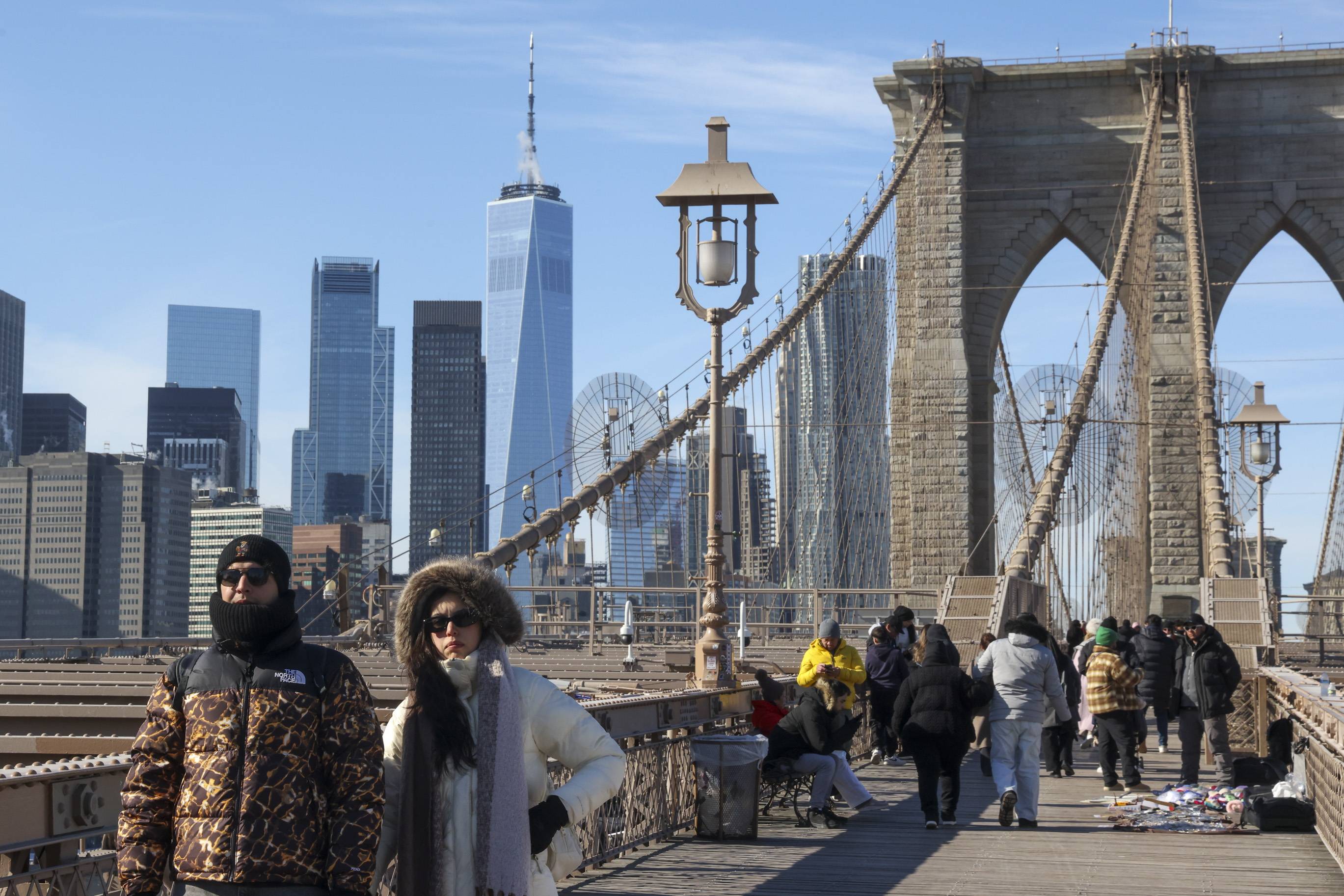 2月9日,人们走在美国纽约布鲁克林大桥上。 新华社/欧新