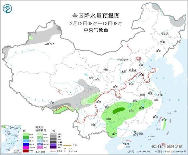 图1 全国降水量预报图(2月10日08时-11日08时) 图片来源:中央气象台网站