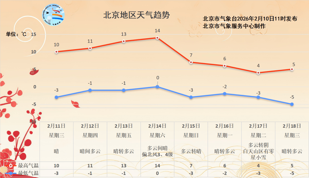周六(2月14日)冷空气再度进京,北风加大。周日气温大跳水,白天最高气温下降至6℃上下。请关注临近预报,做好防范。