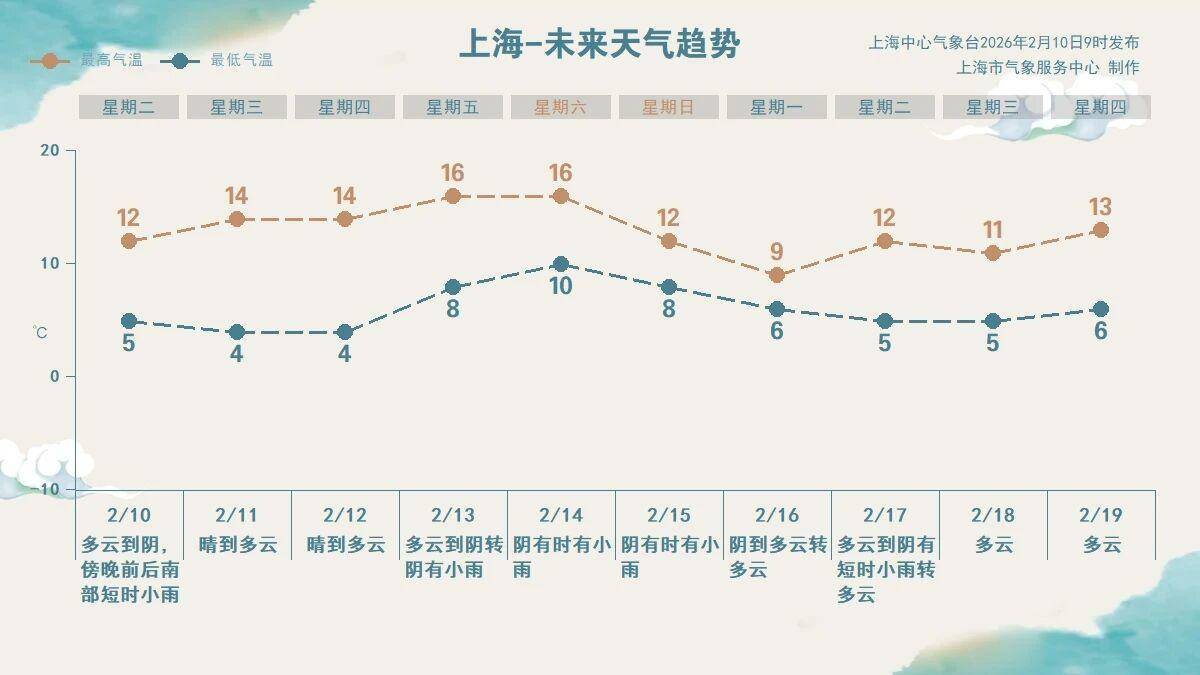 东方网记者柏可林2月10日报道:受短波槽东移影响,昨天半夜到今天凌晨上海普降小雨,白天上海云系较多,以多云到阴为主,预计傍晚前后南部可能还会有些短时小雨,对晚高峰影响不大。今天气温并不低,预计白天最高气温12℃。今天主要吹偏西风,风力3~4级,相对湿度90%~50%,体感略有些湿冷。